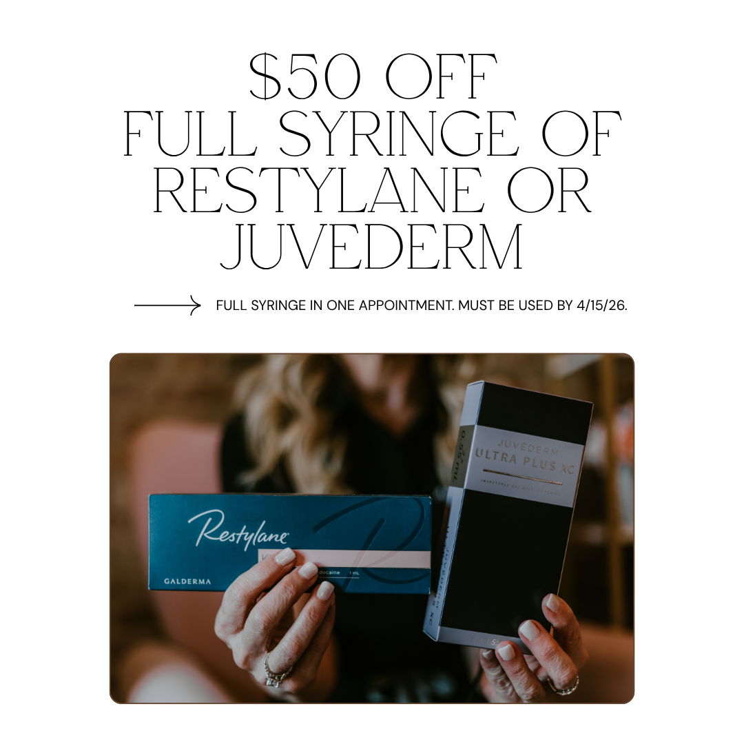 Receive $50 off the purchase of any full size Restylane or Juvederm filler. The full syringe must be used in one appointment, and it must be scheduled by 04/15/26.